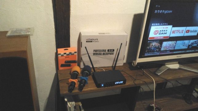 我が家にはピカラのインターネット用光ケーブルがきていてTP-Linkの無線Lanルーターで家中がWiFi環境になっている。音楽室のテレビにはAmazonのFire Tvスティックをつけていて、家庭用のカラオケ@DAMに加入していて14万曲以上を楽しめる。中央にあるのはKitHouseの無線マイクセットで2本の充電式マイクとアンテナ付きの受信機だ。テレビからのカラオケ音楽と無線マイクの入力をミキシングした信号をステレオにつないで鳴らしている。カラオケ@DAMは月880円だが、一昔前のレーザーカラオケが数十万したのを考えると隔世の感がある。お勧めだ。