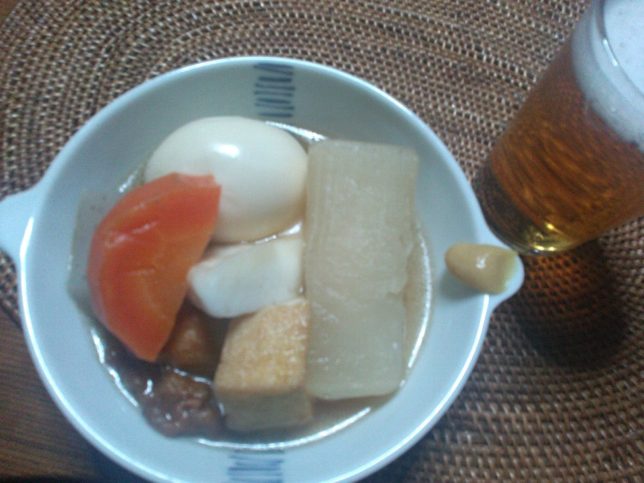 今日のビールのあてはおでん。菜園で採れた今年の大根は太くて柔らかく、なかなかおいしい。おでんの季節もそろそろ終わりかな。