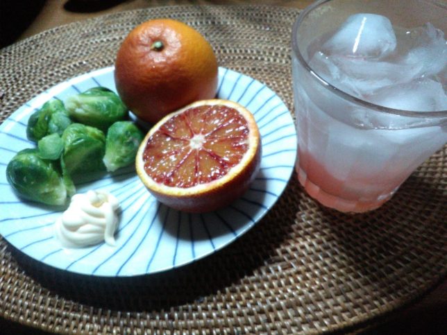 今日の晩酌は焼酎のタロッコ割り。あては、菜園の芽キャベツ。タロッコ割りは、いやあ・・・、ちょっとうますぎる。