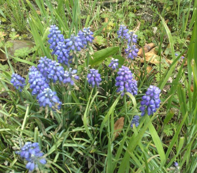 今日の一枚は裏の20号園地に生えているムスカリ。鮮やかな紫色で小さくてかわいい花がブドウの房のように密集して咲いている。野草の花も花盛りだ。