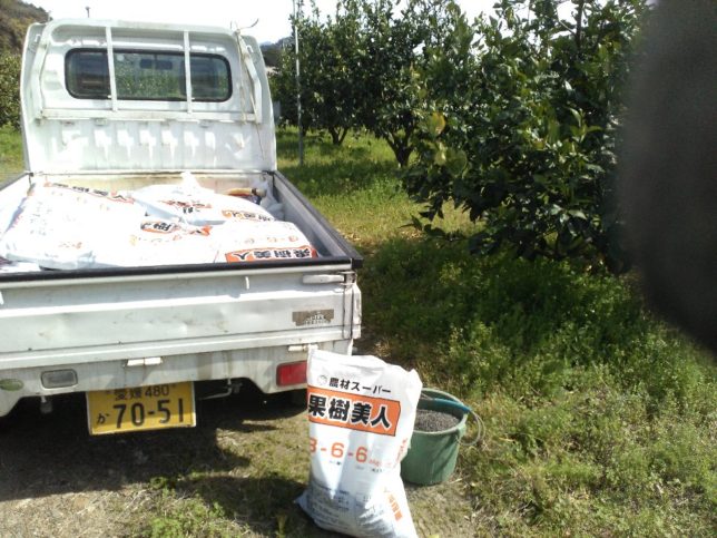 撒いた肥料は”果樹美人”。農林スーパーが販売している肥料だ。名前がいい。ここの肥料には他に、”完熟物語” と ”旬果秀糖” がある。どれも名前が凝っている。昨年は”旬果秀糖”を使ったのだが、今年は予約が遅くて売り切れ。他の二つを購入した。そんなに中身は変わらないと思う。撒く量は10アールあたり、5から7袋が標準。この園地は30アールあり、今回は21袋撒いた。10アールあたり7袋で多めだ。