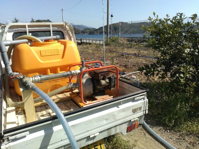 午後は昨日作ったスプリンクラー用のポンプ台の試運転を兼ねて、新田地区の今年植えた苗木に潅水作業をした。苗木が植えてある場所にブルーの潅水用の樹脂製のチューブ(タフカンスイ)を敷設してそこに水を送り込んでいる。チューブには小さい穴が空いていてそこから水が噴き出すようになっている。500リッターのタンクがものの5分くらいでなくなってしまう。6往復ぐらいした。