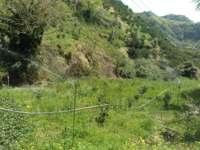 午後はオヤジだけで行司が谷の紅まどんな園地に水やりの続き。ここは水源(水タンク)があるのでスプリンクラーで水をまいた。スプリンクラーだとホースで一本一本水やりするのと比べると楽ではあるが、そのかわり時間と水がいっぱいいる。10アールに10トン水を撒いて、やっと降雨量10mm相当だ。これだけ巻くのに30分はかかる。ホース1本1本、100本の苗木に10リッターずつ水をやると一本1分はかかるので100分以上必要。どっちにしても時間はかかる。今日はスプリンクラーを使った。