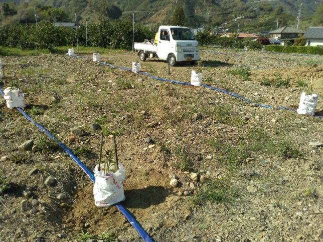 午後は新田地区の今回植えた苗木に肥料袋のカバーをした。植えてから2回は潅水しているので、苗はまずまず元気だ。芽が出始めているのもある。芽がでればこっちのもんだ。青いのは潅水チューブだ。小さい穴が開いていて水が噴き出すのだが肥料袋のカバーがあれば効率的に水が苗木の根元にかかると思う。なかなかいいアイデアかも。