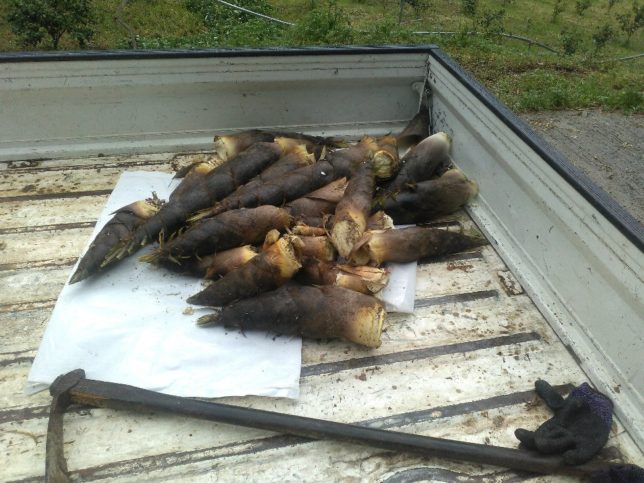今日も朝からはっきりしない天気。タケノコが出てきているようなので、小雨の中、行司が谷の南西園地に掘りに行った。結果は20本ほどゲット。これからどんどん出てくる。放っておくとミカン畑が竹藪になってしまう。自分ちだけでは消費しきれないので近所に配った。