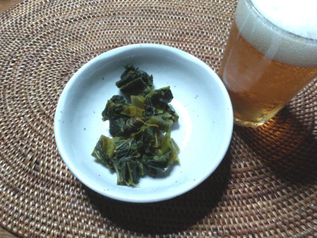 今日のビールのあては、高菜漬け。甕につけこんだのが1週間前で、今日は試しに少し取り出して試食。だいぶ塩が効いていたので半日ぐらい塩抜きして小さく刻んだ。なかなかいけます。一か月くらいすると古漬けになるとか。