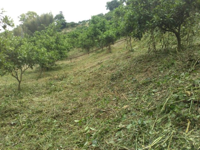 今週はずっと雨がふりそうなのだが、今日は何とかもった。朝から影平地区のデコポン園地の草刈りだ。午後4時ぐらいまでやってなんとか終了。ここはお茶の木が多いところ。ここ2,3年放っておいたらすごく伸びてきている。また、小さいお茶の木がデコポン園地の中にあちこち生えてきている。お茶の木は幹が一本ではなくて小さな幹がいっぱい生えるので、いったん生えると処理が面倒。やっかいだ。今回の草刈りはナイロンコードなので、葉っぱや小さい枝は刈れるのだが、枝までは落とせなかった。金属刃で刈りとってもまた芽を出してきそうではある。毎年こまめに刈り取るしかなさそうだ。今日の草刈りの成果がこちら。
