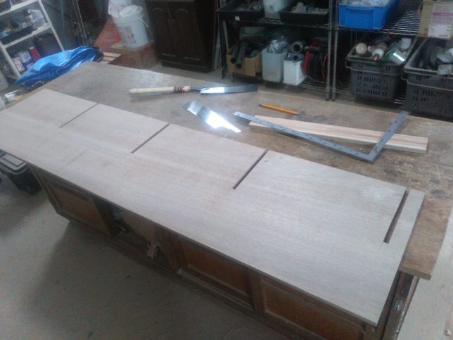 朝から雨、昼には上がったが今日はお休みにして風呂場の脱衣場の棚作りだ。今も箪笥が置いてあるのだが、それでは足りないので思い切って大容量の棚を作ることにした。材料は合板。合板も最近は値上がりしている。ラワン合板のノンJAS品にした。一枚1750円。これを切って切れ目を作っていった。
