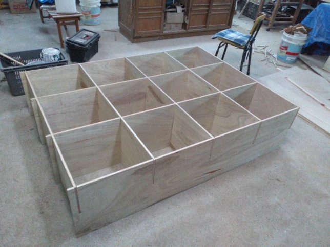 このあとは、板ごとにパテ塗りをしたあと塗装して、現場で組み立てる予定。収納するのは衣類やタオルなので強度的には合板でも充分なはず。部屋の柱も利用して、金具を使ってしっかりしたもんにするつもり。色をどうするかは、思案中。