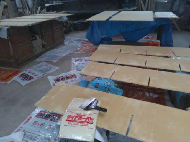 今日も雨。しっかり降っている。梅雨が始まったかのようだ。今日も朝から棚づくり。今日は塗装前の下地調整だ。以前に、蔵の天井塗りの時に買いこんでいたワイドスーパー60が残っているのでそれを棚板に塗った。これを塗ると合板の粗い下地に入りこんでくれて、固まったあとのヤスリかけも簡単で塗料がきれいに塗れる。ワイドスーパーと水を3対2でよく混ぜたのをパテベラで塗りつけていくのだが、均一にキレイに塗るのは難しい。こういう職人仕事は年季がいる。まあ、あとでサンダーをかけるんだけど。片面を塗ったところで今日は終了。