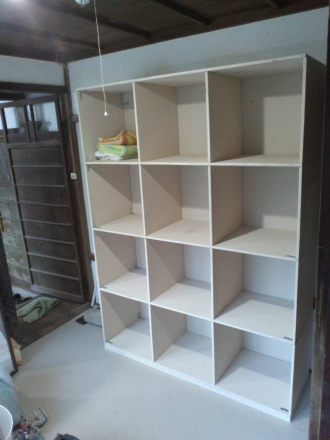 今日は農作業はお休み。朝から脱衣所の棚の組み立て作業だ。薄い合板の材料を金具でつないでいくのだが、ビスが小さいので電気ドリルはつかわずにドライバーで手締めしていった。夕方までかかった。