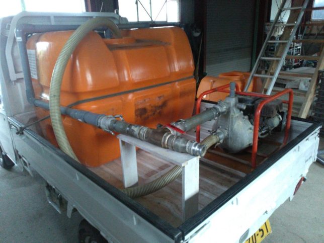 午後は無理をしないで、ゆっくり昼寝をしたあと農薬散布の準備。農協に頼んでいた農薬類を引き取りに行ったあとは、軽トラにのせる800リッタータンク用に配管のやり直し作業だ。今までエルフに2000リッタータンクを載せていたのだが、エルフを廃車することにしたので軽トラ用に隣の従妹から譲ってもらったタンク用に新たに配管した。