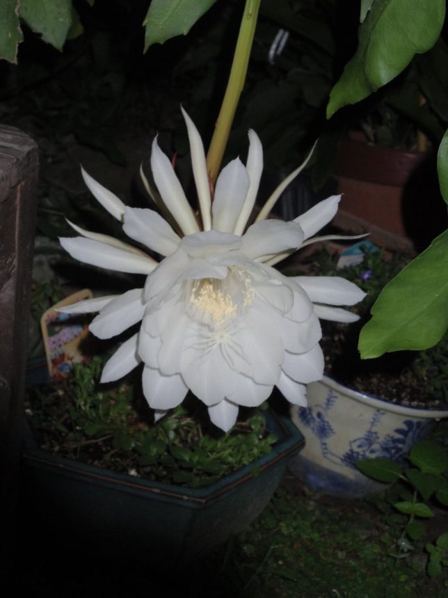 寝ようとしていたら、奥方が月下美人が咲いていると起こしにきた。直径20cmはある大きな花が咲いていた。松野の虹の森公園の売店で二株買ったのはいつだったろう。数年はたっている。真夏の夜の夢のような花だ。