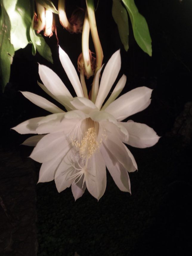 前回いつだったか、育てている月下美人が咲いた報告をしたのだが、新たに今日一輪咲いてくれた。二株あるのだが、一株はまったく花はついてない。もうひと株は全部で12個のつぼみがついていて昨日から蕾が上を向いてきていてそろそろ咲く頃だと思っていたが、今日一輪大きな花が咲いた。