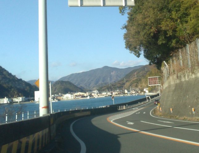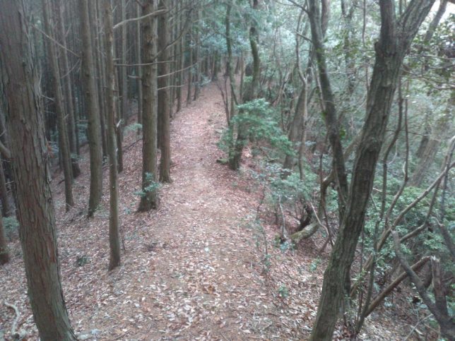 道の左側は西予市側で檜が植林されている。右側は宇和島市側で雑木林になっている。四分の一登ったあたりから海側の景色が木の間から垣間見えるようになる。