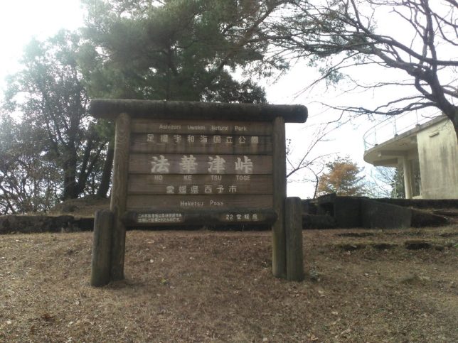 朝から気合を入れて出発。いでたちはいつもの農作業の服で、履いているのはゴムスパイクつきの地下足袋。リュックにガイドブックとみかん2個。法花津峠の展望台まではいったん西予市に入り、旧国道56号を軽トラで登って行って、そこに車を駐車。登山口はガイドブック(山と渓谷社、新-分県登山ガイド37 愛媛県の山)によると展望台から旧国道56号を200mほど下ったところからだが、オヤジは展望台の近くの歌碑がある裏から登った。