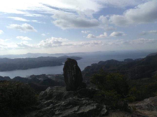 見晴らしはまずまず。今日は残念ながらかすんでいたが、法花津湾、吉田湾、宇和島湾、戸島やその先の日振島も良く見えた。その先にかすかにかすんでいるのは九州だ。
