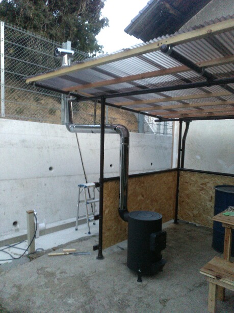 ストーブと板壁が近いので、不燃材で防火壁を作る必要がある。奥の方に薪置き場も作らねば。