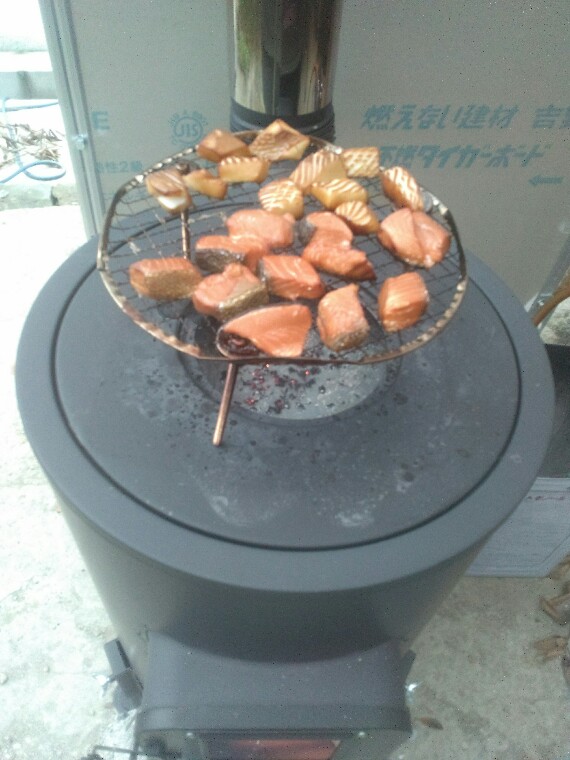 その後は奥方と買い出しに。帰ってきてからは薪ストーブに火を入れて、燻製作りだ。材料はシャケとイカとプロセスチーズ。シャケとイカは前の日から水と塩と砂糖のなんとか水に浸けて一晩冷蔵庫に保存。朝、水気を切った状態で冷蔵庫で保存しておいた。