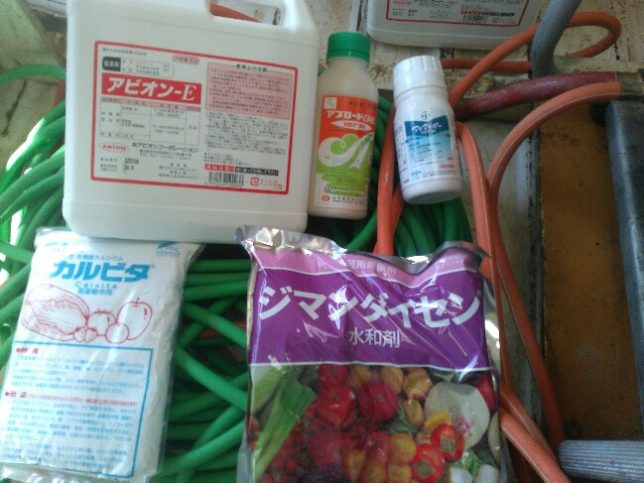 今日から黒点病などの農薬散布の1回目を開始だ。秋までに4回ほどやることになる。まずは手がけで、新田地区の宇和ゴールドから。使った農薬はこちら。
