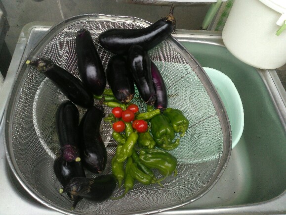 夕方、奥方と菜園で野菜の収穫。どんどん出来てくる。今日はナス、トマト、ピーマン、ししとう、万願寺など。きゅうりやナスなど食べきれなくなってきている。今日はパクチーの種も収穫。