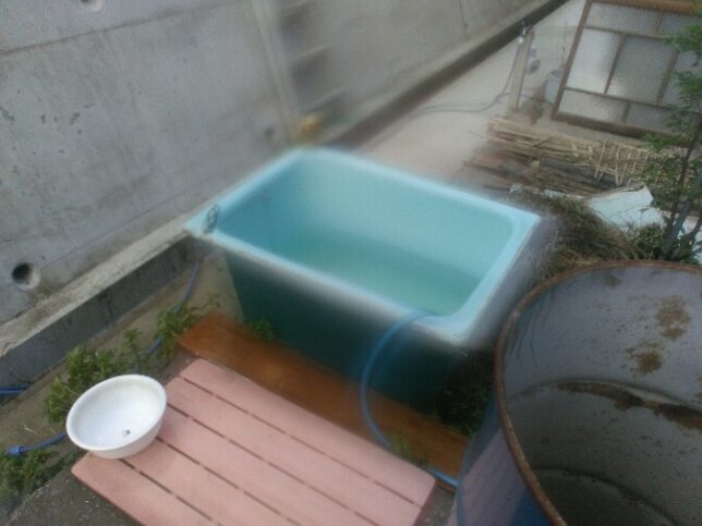 昨日から風呂の改修工事をやってもらっている。これまで色々手を入れてきたが全面改修することに。昨日から工事が始まって、風呂に入れなくなっている。奥方の方は隣家の風呂を使わせてもらっている。親父は昨日はドラム缶にお湯を貯めて入ってみた。ちょっと狭くて膝を折り曲げられない。一応体を洗って終了。今日は取り外したFRPの浴槽にお湯を貯めて、露天風呂。お湯は太陽熱温水器から引いた。それだけだと熱いので井戸水を入れて温度調節。快適だ。ビールを飲みながら楽しんだ。我が家は一番奥にあり、6時を過ぎると人も通らないのでスッポンポンでも問題なしだ。手前にあるのは昨日使ったドラム缶。