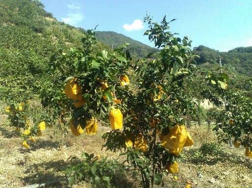 その後は奥方と紅まどんなの袋掛け作業。紅まどんなは果皮が弱くて秋に雨が降るとクラッキングなどの障害が出るとされている。そのため屋根かけ栽培が推奨されているが、オヤジからすればたかが10月、11月の2ヶ月間のために数百万円もかけてハウス設備を作るのは抵抗がある。ということで、次善の策で推奨されている油紙を使った袋で実を包んでいるのだが、これも本当に必要かどうか。オヤジは果皮障害対策として、果皮増強剤(カルビタP)を9月に2回散布している。まあ、袋掛けはお付き合いみたいなもんだ。そのうち袋掛けもやらなくていいようにしたい。紅まどんなは雨が少ないせいか小ぶり。でも出来はまずまずかな。収穫量は確実に増えそうだ。午後もやって4分の1終了。