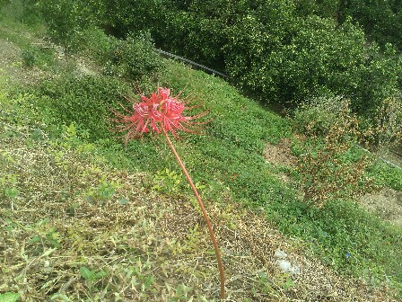 今日の写真は彼岸花。別名曼珠沙華。大体が群生しているが、たまに一本だけポツンと咲いているのもある。奥方の疑問だが、種では増えなくて球根で増える彼岸花がなんで一本だけポツンと咲いているのか。誰かが球根を植えたならわかるけど、植えそうにもない農道の横に咲いている。疑問は解けない。