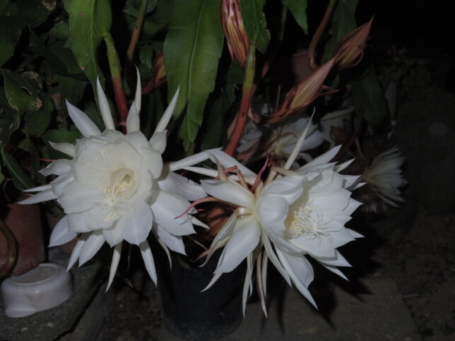 夜、月下美人が咲いた。今年4回目だ。奥方によると最初つぼみは20くらい付いていたようだ。今日は5個咲いた。明日も6個ぐらい咲きそうだ。