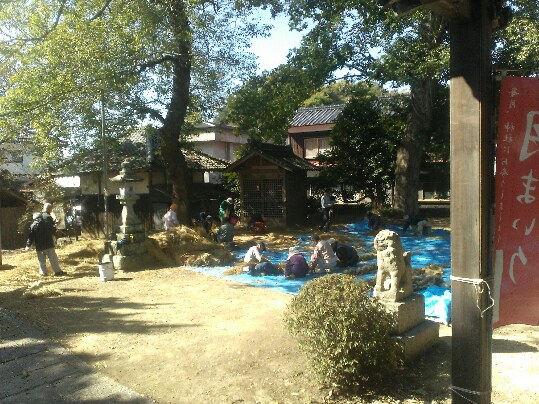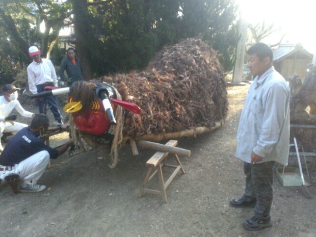 今日から11月。月日が経つのは早いね。今日11月1日はおはけ。法花津地区の各部落に祭りの旗が立つ日。神社総代は8時に神社集合。祭りの準備だ。今年は法華津地区の半分の与村井地区の担当で、神社のしめ縄作りや祭りに使う神輿や太鼓台のどのしめ縄を作るのと、牛鬼を新しく作る作業を部落の人総出でやる日だ。牛鬼は竹で作るのだがそのままでは重いので一年寝かしておいて軽くしたのを使う。今年使うのは一昨年作ったやつ。(去年は御練りは中止だったので)
