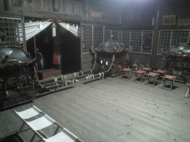 夕方提灯に火を入れて、5時から宵祭りの神事が始まる。これまで練習を積んできた浦安の舞の奉納。なかなかの出来だと思った。お母さんたちも外で見ている。参加しているのは神社総代と自治会長たち。神社総代を代表して榊の奉納を行った。5時半ごろ終了。神事が終わった後の拝殿の写真がこちら。