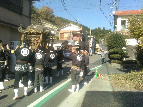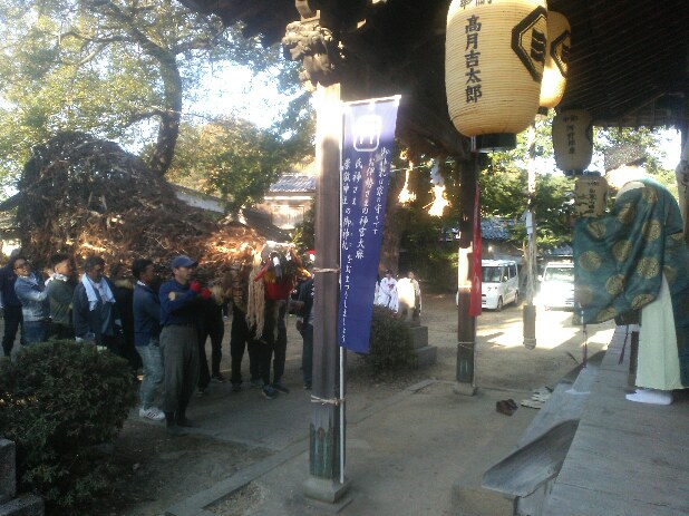 今日は秋祭り本番。6時半に総代さんは集合。準備に抜けがないかチェック。7時には神主がきて御供物などの準備。7時半にはお練りのメンバーが続々集合。8時前に、まずは鹿の子の演舞から。