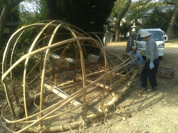朝7時半に三島神社に。昨夜トラックが灯籠に当たって、灯籠が倒れる事故があった。トラックの方は問題なし。朝から地元の建設業者清家組がユニッククレーンを使って復元してくれた。その後は総代さんたちと片付け作業。まずは与村井公民館の片付け。昨日の宴の後がそのまま残っている。その後は神社の提灯や幕の片付け。一通り終わった後は牛鬼の解体作業だ。みんなで1時間ほどかかって解体。次に残す部品を取った後、焼却処分にした。