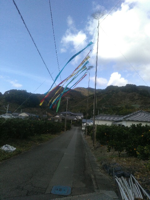 今日は亥の子の日。東京育ちのK脇夫人にはなんのことかわかんなかったようだが、どうも関西で行われている行事のようだ。ここいらではまだ引き継がれていて、子供たちが亥の子の数え歌を歌いながら、各家の庭で石にロープを何本もつけたので穴を掘るのだ。本当はその後各家からご祝儀をもらうのだが、今では事前に集めに来る。その代わりに紅白の餅をもらうのだが、今ではシャトレーゼのバームクーヘンの紅白のセットだ。オヤジのガキの頃は公民館に子供たちが毎晩集まって数え歌の練習をしたのが楽しかった思い出がある。今でもこの風習が続いているようだ。今日の一枚は部落の入り口に立てられた亥の子の旗だ。子供が生まれるとこの旗を作るのが続いている。