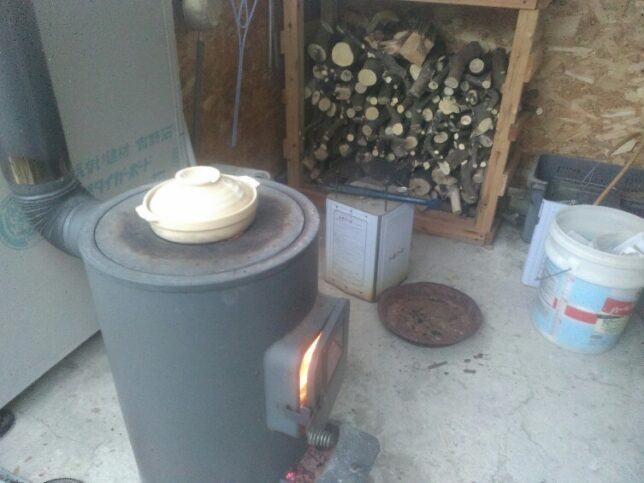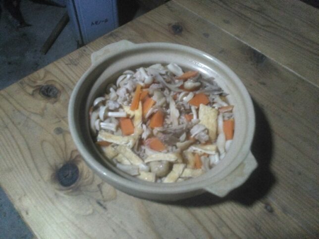 帰ってから久しぶりに薪ストーブに火を入れて、鶏釜飯を作った。鶏肉とあぶらげ、人参、しめじ、舞茸入り。米1合と具材を小さい土鍋に入れて薪ストーブで直火で加熱。