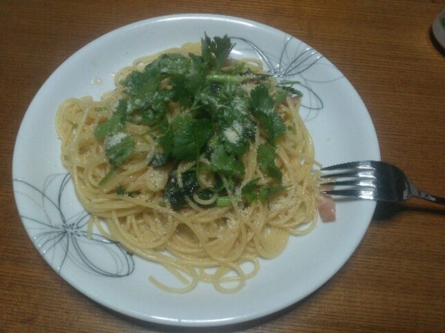 お昼はパスタ。久しぶりに奥方にノラボーナ・ペペロンチーノ エ パクチーノを作ってもらった。お昼前に雨の中、畑にのらぼう菜とパクチーを引っこ抜きに行った。パクチーが効いている。