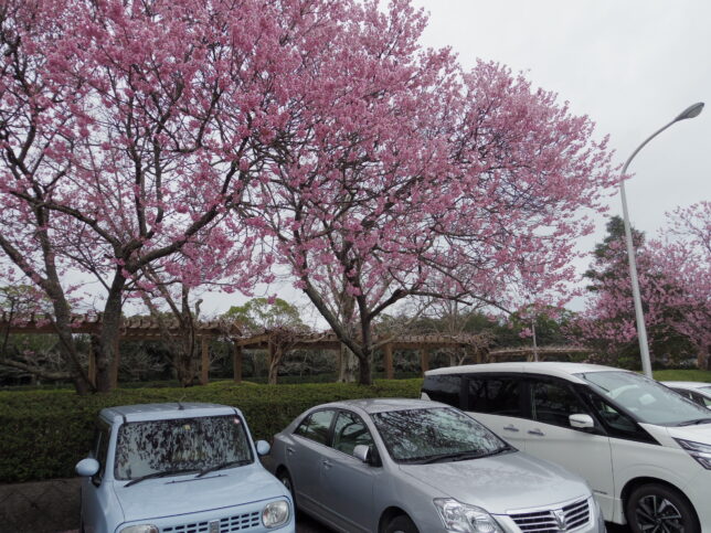 今日は曇り空。結構寒い。朝一に選果を1時間ほどしたあとはお休みにして、久しぶりに南の方角へお出かけだ。まずは南楽園へ。梅まつりをやっている。我が家の梅の花は散っているのでもしかして、と思っていたが案の定ほとんど散っていた。でも梅まつりはやっていて遠くからの観光バスも来ている。咲いているのはボケと木蓮ぐらい。駐車場の河津桜らしいのは満開だった。