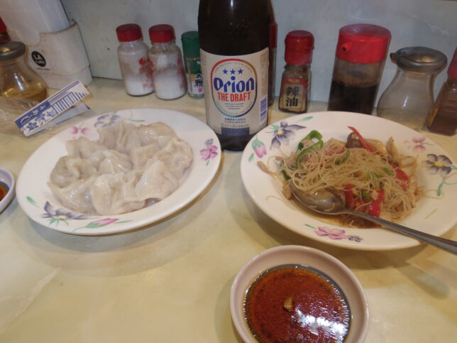 夜はサン連チャンでホテルの近所の居酒屋へ。イカゲソから始まって、マグロ、アンガス牛のステーキなど食べた。泡盛の古酒も。そのあとはゆいレールに乗って旭橋駅から交際通りの牧志駅へ。国際通りを先日の反対方向から散歩。県庁側はお土産屋が多かったが、牧志側は飲食店が多い。通りを一本入ったところの国際通り屋台街をうろつく。満員で入れなくて、すぐ横のお店に入った。ここが大正解。水餃子とビーフン炒め、オリオンビールを注文した。美味しかった。