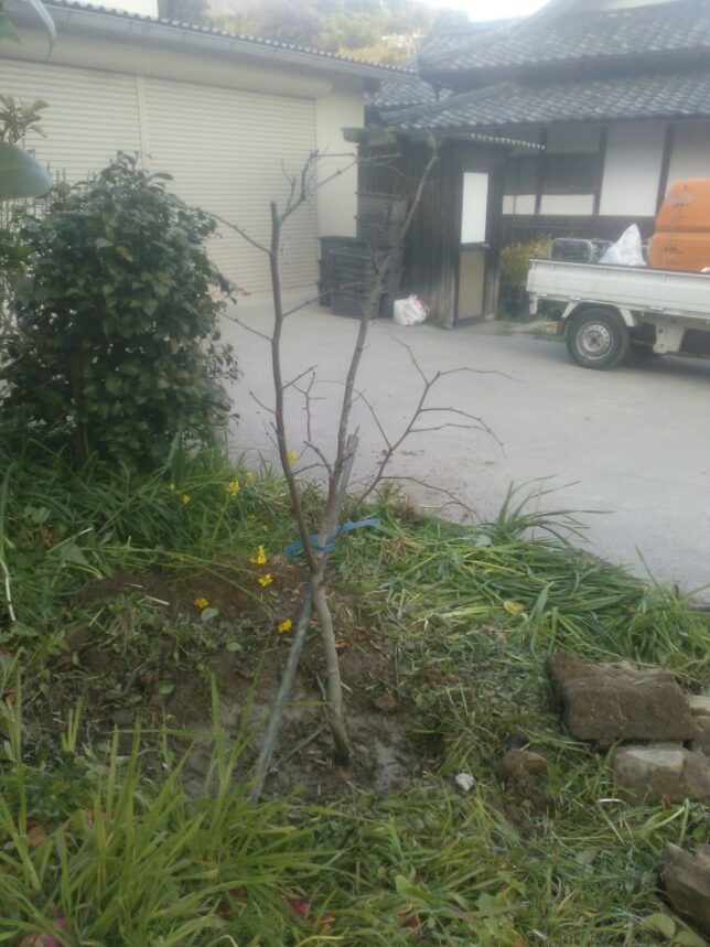 今日はコークボ地区の苗木植え。4年前に100本ほど早生の苗木を植えて、昨年から収穫を始めている。しかし、その間に10本枯れてしまっている。朝から穴掘り。10時ごろから奥方と苗木植え作業。昼には植え終わった。