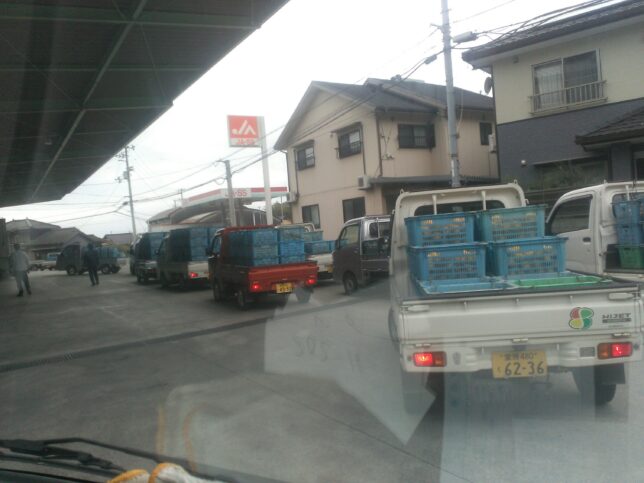 今日は宇和ゴールドの出荷日。昨日までに選果したのを出荷だ。しかし、共選前は大混雑。昨日、一昨日と共選が休みだったので出荷の列になっている。いつもなら10時ごろには出荷する人も少なくなるのだが、今日は11時ごろまで列をなしていた。オヤジは途中で諦めて午後に出荷することにした。