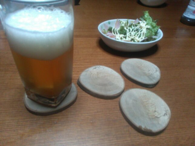 四時半に収穫作業を終えて、少し工作。昨年、三島神社の桜を切った時に、燻製用のチップを作るのに直径10cmぐらいの枝をもらってきていた。今日はそれを切ってコースター作り。BellaのFlyの話をもとに、まずはDCMに行って一番高いノコギリを購入。今回はチェーンソーはやめてそれを使って厚さ10mmぐらいの輪切りにした。一応できたのがこちら。