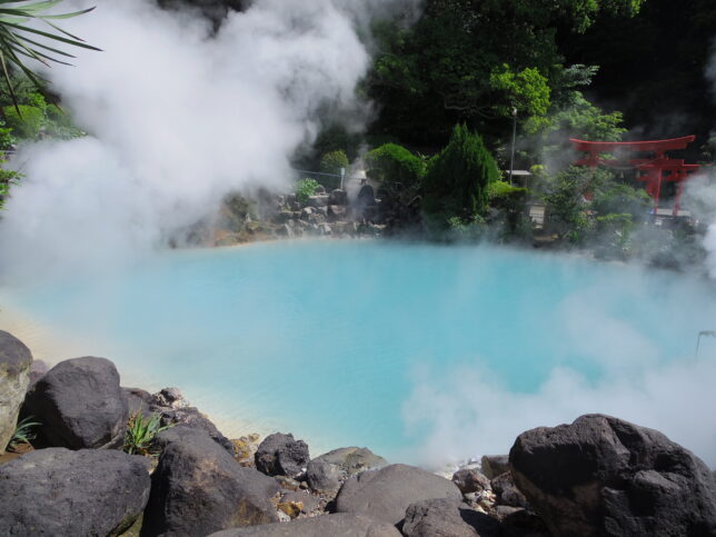 少しゆっくりした後、近所の海地獄見物に行った。温泉が沸いている池の底が青いのが名前の由来のようだ。