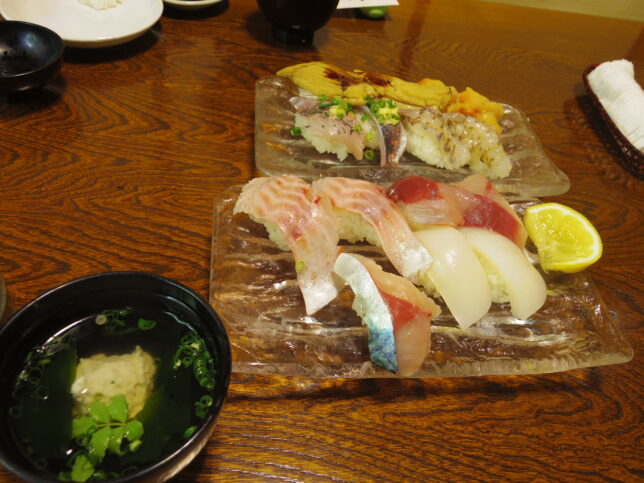 昼食は駅から5分くらいのところにある大和田寿司。予約なしでうまく入れた。関サバ、関アジなどの地魚の寿司を注文。満足でした。