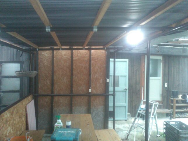 午前中は薪ストーブ小屋に電球をつける作業。スイッチとコンセントもつけた。昼までかかった。