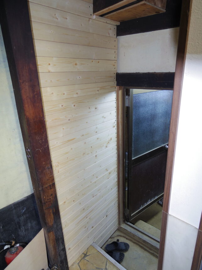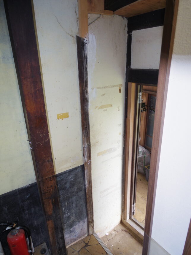 今日から勝手口の改修工事を開始。我が家を訪れる人は、あんまり玄関からは来なくて、台所の横の勝手口からくる人が多い。その勝手口だが、老朽化していて壁と柱に隙間があったり、隙間が多くて冬に隙間風が入ってくるなど問題が多かった。それに加えて見栄えが悪いので今回改修することにした。現状がこちら。