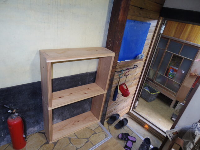 帰ってからオヤジは工作の続き。切り出した材料を組み立てた。棚の置き場に仮に設置したのがこちら。先日リフォームした勝手口の横に設置する。この後塗装して終了だ。