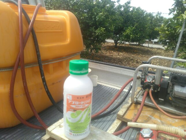 午前中は宇和ゴールドに農薬散布。先日剪定していてヤノネカイガラムシがついている木にはピンクのリボンをつけておいた。130本ある宇和ゴールドでヤノネカイガラムシがついていたのは40本ぐらい。およそ三分の一だ。ヤノネカイガラムシは成虫は黒い胡麻のようで、実について商品価値がなくなるのと、繁殖すると木が枯れるようになる。ピンクのリボンをつけた木に殺虫剤を散布。殺虫剤はアプロードエースの1000倍だ。