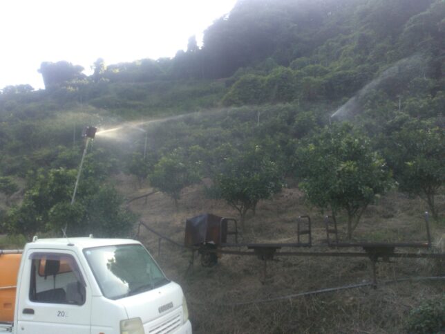 その後は黒点防除の3回目を開始。置いてある積算雨量計は300mmを越して満杯になっている。3回目の防除は待ったなしだ。スプリンクラー設置園地のうち和田地区から。夕方までかかって和田地区、影平地区、新田地区を終了。