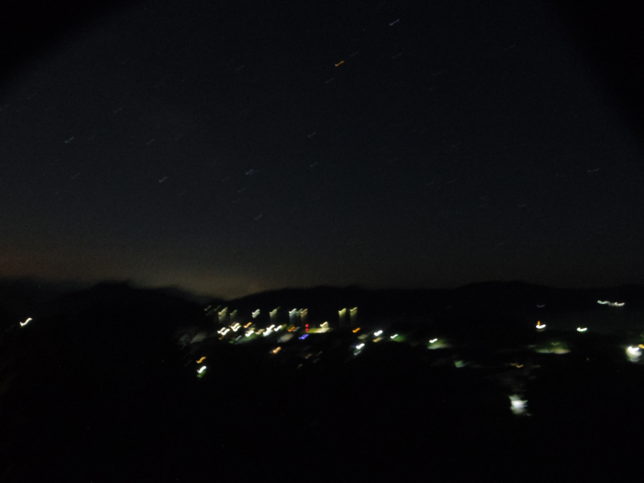 今日から牛鬼祭り。(オヤジには和霊様の方がしっくりくるんだけど)。今日は夜8時から花火がある。8時になるとここまで花火の音が聞こえてきた。奥方とテトと一緒に裏山に登ってみた。低い花火は見えないが、たまに上がる高くまで昇る花火は見えた。写真に撮ろうと思ったが、うまくいかなかった。