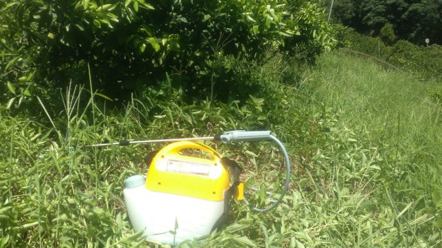 オヤジはコークボ地区の天牛防除作業。ここは早生の若木ばっかりの園地。ホースを引っ張っての防除はやめて、5リッターの肩掛け噴霧器を久しぶりに使ってみた。そいつがこちら。